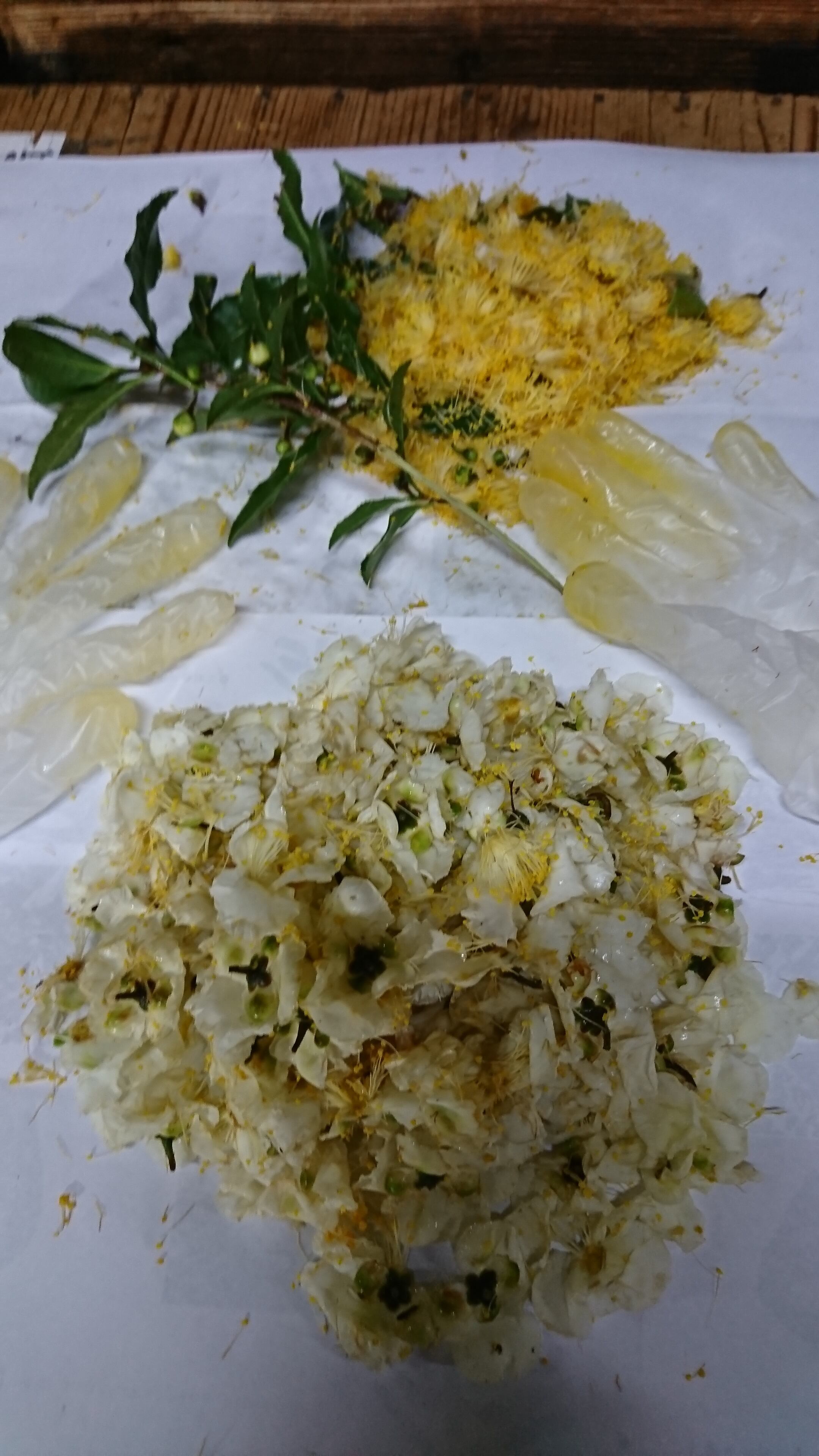 収穫は一苦労です。からだじゅうに黄色い花粉が、ついてしまいます。